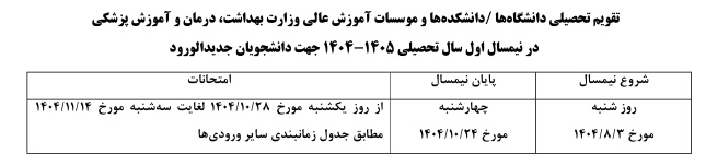 تقویم نیمسال دانشجویان جدیدالورود 1404