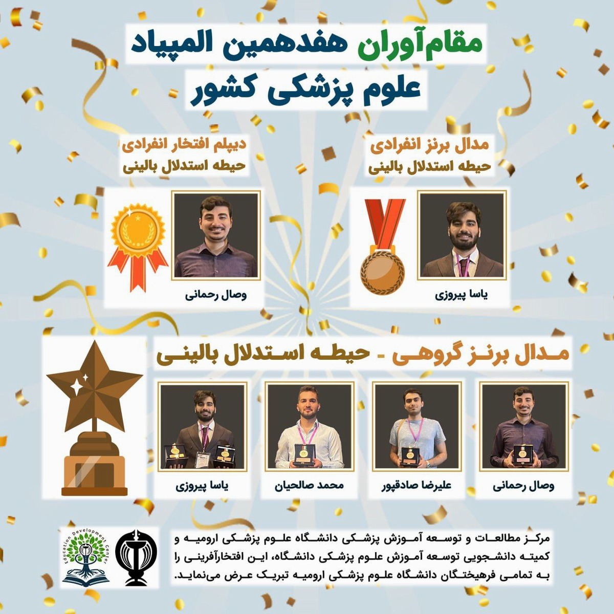 دکتر یاسا پیروزی : مدل برنز انفرادی در حیطه استدلال بالینی  دکتر وصال رحمانی : دیپلم افتخار انفرادی در حیطه استدلال بالینی دکتر وصال رحمانی، دکتر علیرضا صادقپور، دکتر محمد صالحیان، دکتر یاسا پیروزی : مدال برنز گروهی حیطه استدلال بالینی