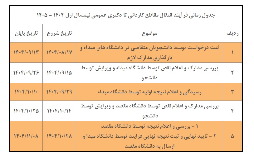 به اطلاع می رساند جدول زمانی فرآیند انتقال مقاطع کاردانی تا دکتری عمومی نیمسال دوم سال 1404 - 1405 به شرح ذیل اعلام شد.با توجه به ممنوعیت انتقال دانشجویان مقاطع تحصیلات تکمیلی تصمیم گیری در خصوص انتقال این دسته از دانشجویان بر عهده کمیسیون موارد خاص وزارت متبوع است.